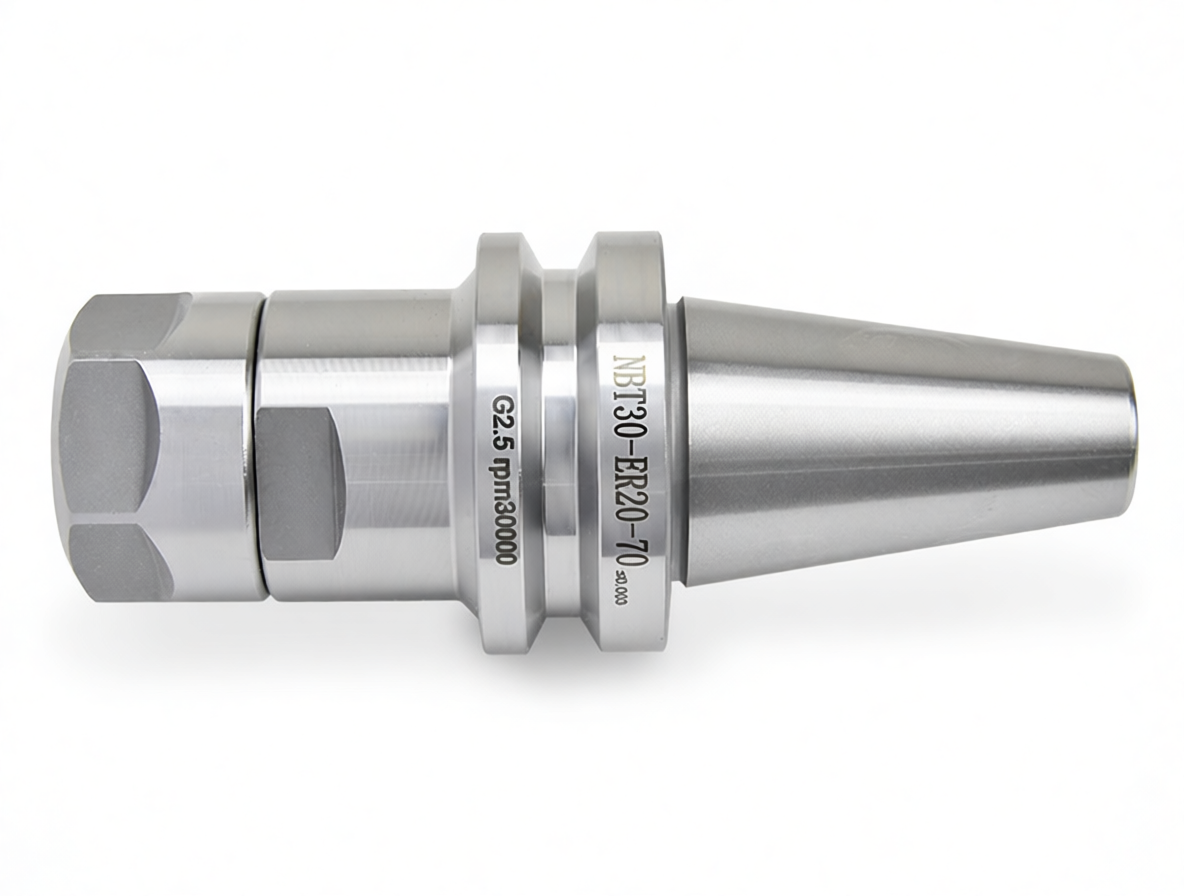 Цанговый высокоскоростной патрон NBT30-ER20-70 с конусом NBT предназначен для фрезерных станков. Он выполнен в соответствии со стандартом DIN 6499 и рассчитан на использование цанг ER20, которые обеспечивают надёжную фиксацию инструмента с цилиндрическим хвостовиком — таких как фрезы, свёрла и другие оснастки. Длина вылета от шпинделя составляет 70 мм.